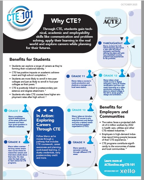 - Grade 10: Marco takes an introductory CTE course in arts, entertainment and design and joins a related career and technical student organization (CTSO).
