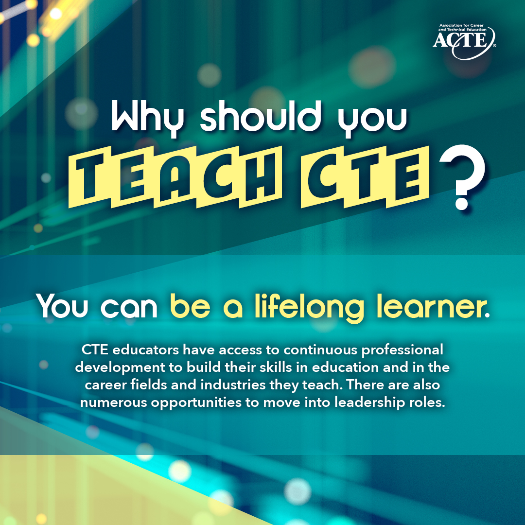 - “Why You Should Teach CTE” Flyer/Handout – This informational sheet lists and describes 10 reasons to become a CTE educator. These core messages can be used to promote the benefits of the profession to students and others who are exploring their career options. (Size 8.5 x 11)